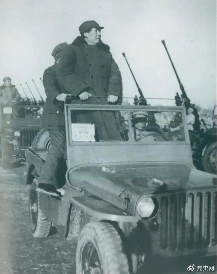 1949年3月25日,毛澤東在北平西苑機場(chǎng)檢閱部隊。